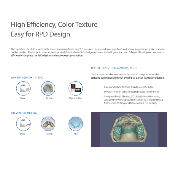 With its high-speed scanning capability-taking only 9.5 seconds for upper/lower non-textured scans-the AutoScan-DS-EX Pro(C) outperforms many competitors. This speed, combined with its detailed color texture capture, supports efficient RPD framework design and subsequent production processes such as wax framework casting and CNC milling. For labs seeking complementary equipment, consider pairing this scanner with the SOL Small Build Platform or the SOL Large Build Platform to optimize your digital workflow. Additionally, the Rodin® Universal Resin Cleaner can help maintain hygiene standards for printed models and components.