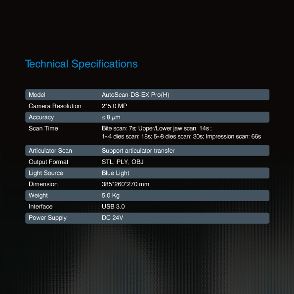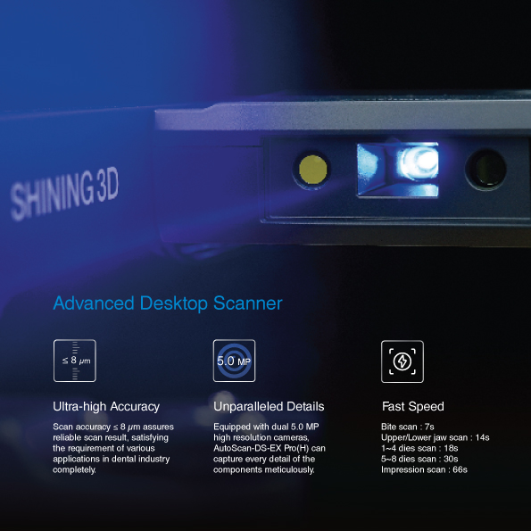 The AutoScan-DS-EX Pro(H), developed and manufactured by SHINING 3D, is a 3D dental scanner with powerful functions for multiple applications covering scans of impressions, plaster models, articulators, implant abutments, etc. Its high-resolution cameras, advanced algorithms, and user-friendly interface bring you with superior data quality with optimal experience.