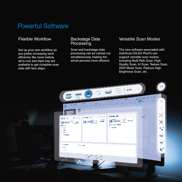 - Flexible Workflow — Set up your own workflow as you prefer, increasing work efficiency like never before, all-in-one and triple tray are avaliable to get complete scan data with less steps.
