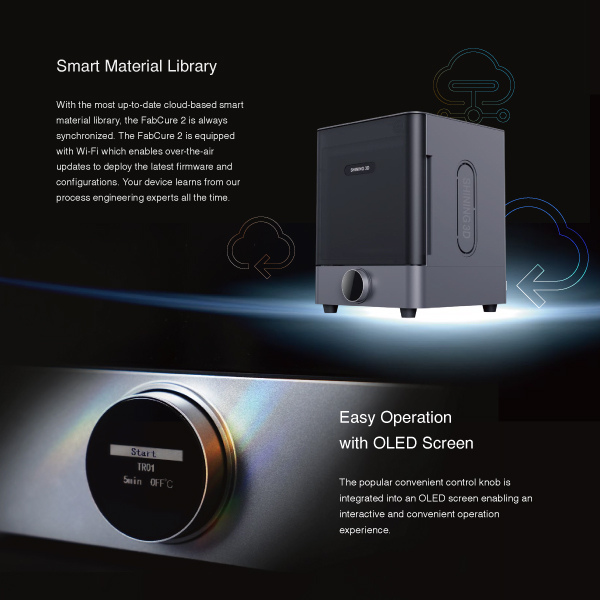 FabCure 2 is recommended as the standard post-curing tool for 3D printers from Shining3D. With FabCure 2, each resin cure profile is finely tuned to bring the part to its peak performance