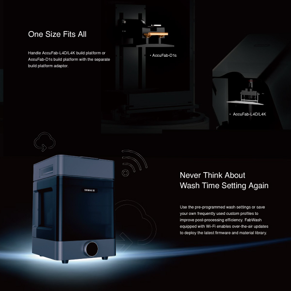 Use the pre-programmed wash settings or save your own frequently used custom profiles to improve post-processing efficiency. FabWash equipped with Wi-Fi enables over-the-air updates