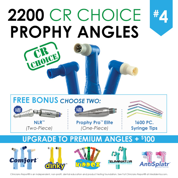 Your practice already needs prophy angles, so why not choose Medidenta’s Incredible Bulk Deal #4 and save some time and money? When you buy 2,200 Prophy Magic angles, you can get two Prophy Magic products for free. Choose from the NLR piece hygiene handpiece, which is lightweight and doesn’t require the use of lubrication, the Prophy Pro Elite, which is compatible with almost all disposable prophy angles, or 1,600 syringe tips.