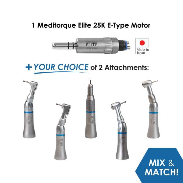 The Meditorque Elite 3 Piece Kit (25k) includes an Etype handpiece, setting the standard for precision and control in your hands. But that’s not all – customize your kit by choosing two from either contra or straight angle couplers, tailoring the kit to suit your specific procedural requirements. - Reliable Workhorse Handpieces: